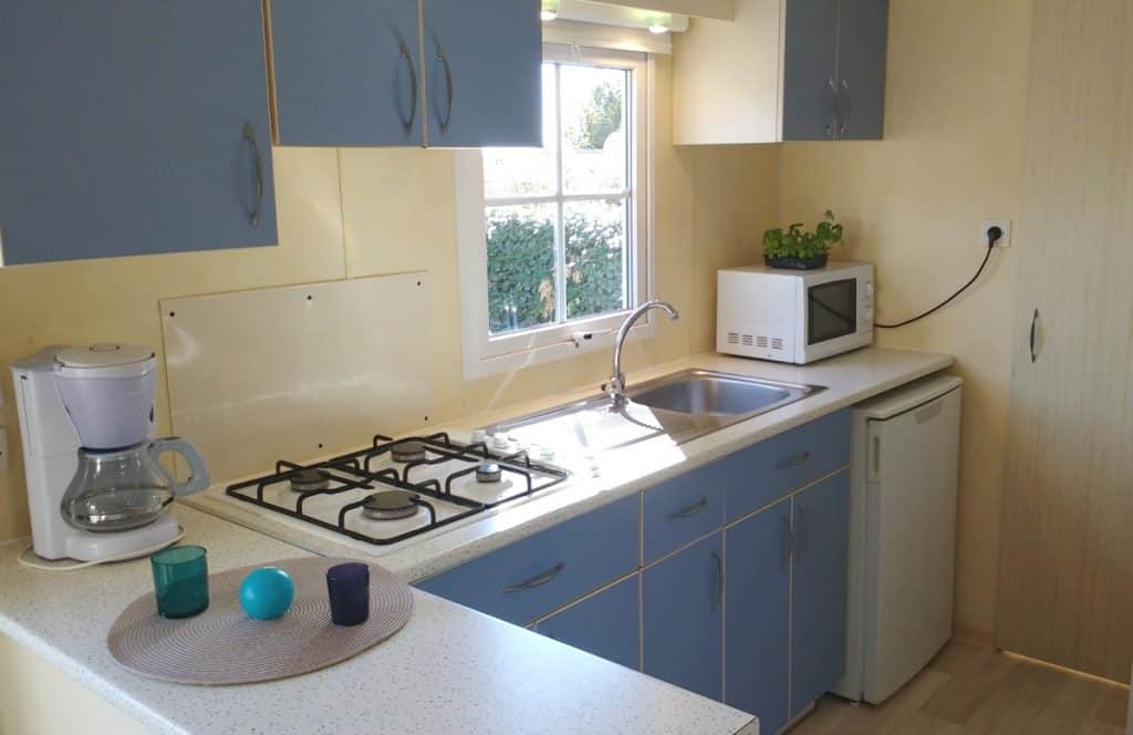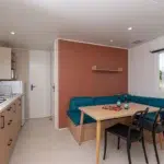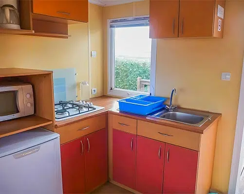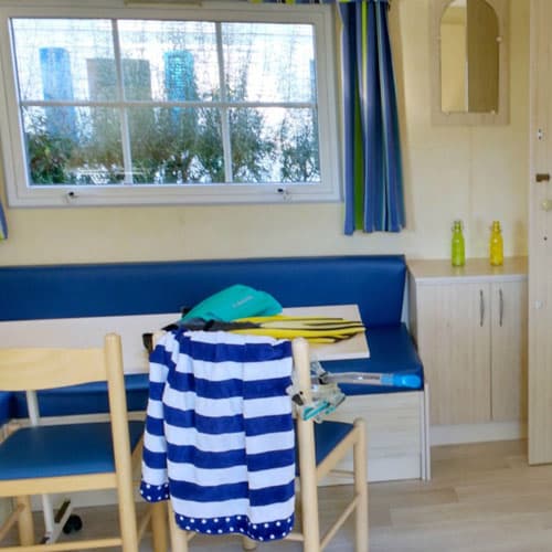 Ce mobil-home offre tout le confort nécessaire pour des vacances en bord de mer réussies : 2 chambres, et cuisine fonctionnelle avec réfrigérateur-congélateur.