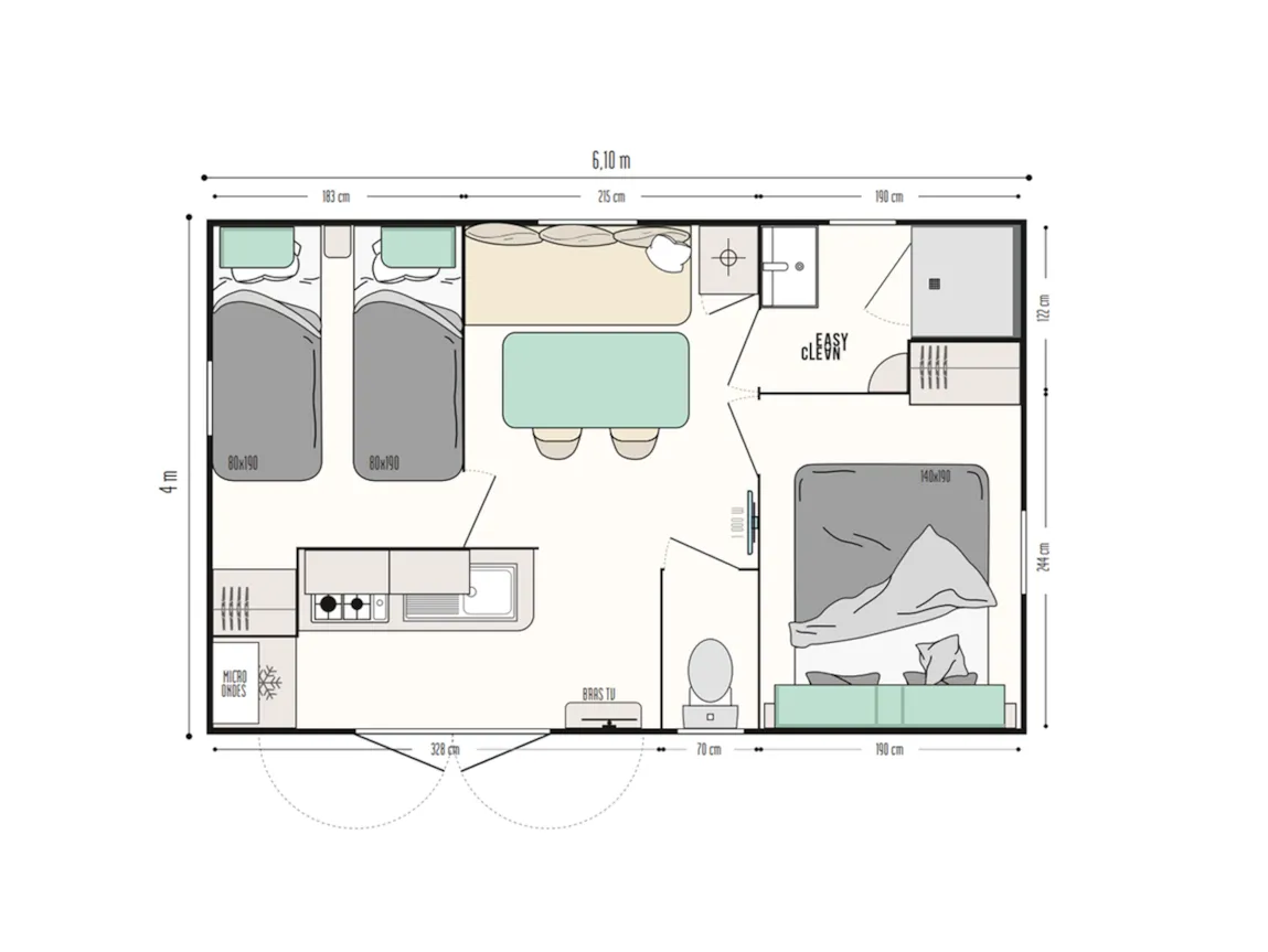 Ce mobil-home est un vrai cocon pour vos vacances à la mer. Idéal pour quatre personnes, il offre tout le confort nécessaire pour se sentir comme à la maison : lit 160 cm, chauffage dans chaque pièce, télévision et coin cuisine bien équipé avec réfrigérateur-congélateur.